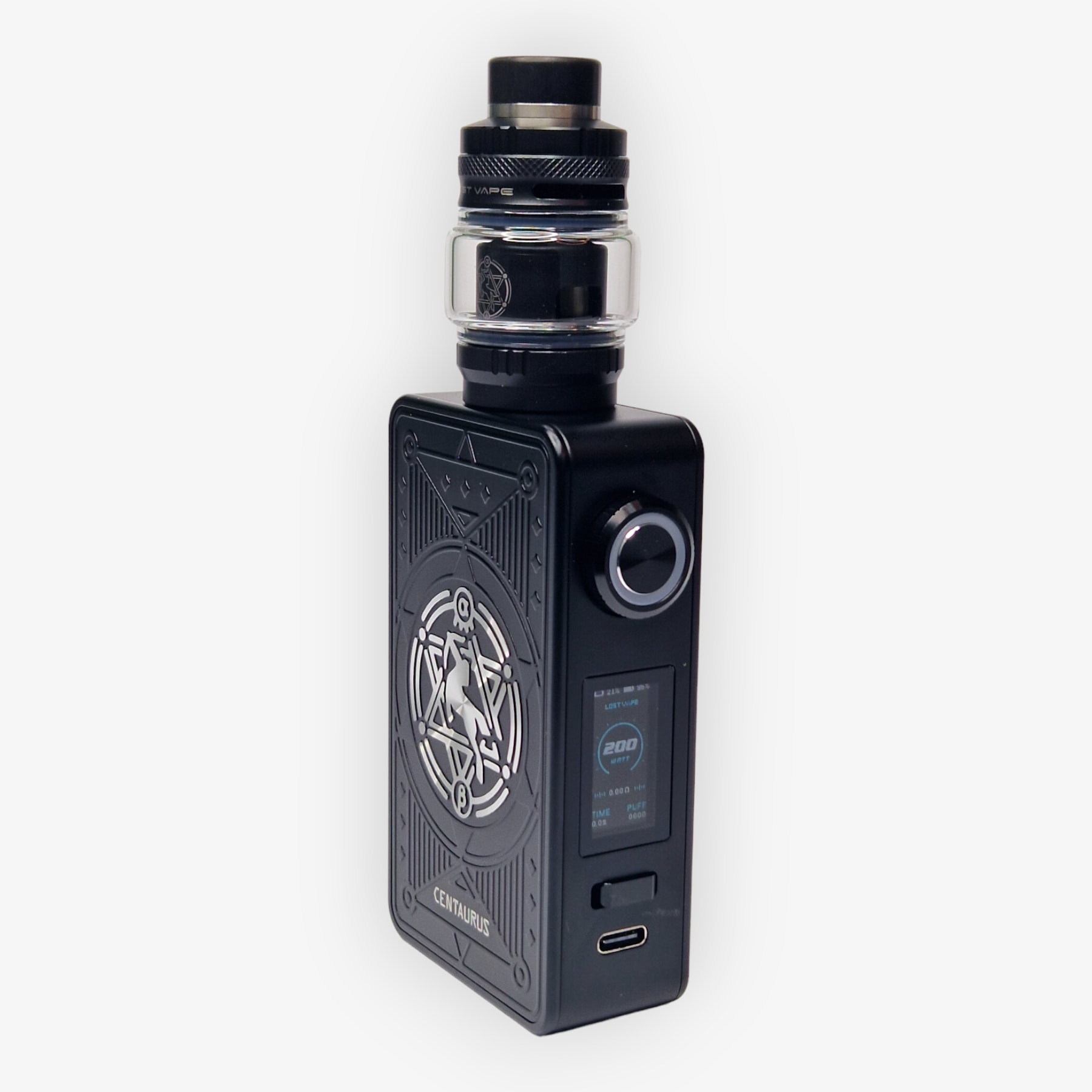 La gamme de cigarettes électroniques Centaurus s'agrandit une nouvelle fois avec le Centaurus M200 ! Conçu en alliage d'aluminium et en acier inoxydable, ce nouveau modèle propose un design plutôt rectangulaire et imposant mais très agréable en main grâce à ses bords arrondis. En effet, la box mesure 93 mm de haut et peut accepter les atomiseurs jusqu'à 26 mm de diamètre, ce qui est justement la taille du Centaurus Subohm ! Les deux s'accordent ainsi parfaitement ensemble pour donner une e-cigarette design et élégante. Les panneaux latéraux forment de jolies gravures au centre desquels on peut distinguer le désormais célèbre centaure de la marque. De plus, ces panneaux sont magnétiques et donc interchangeables !