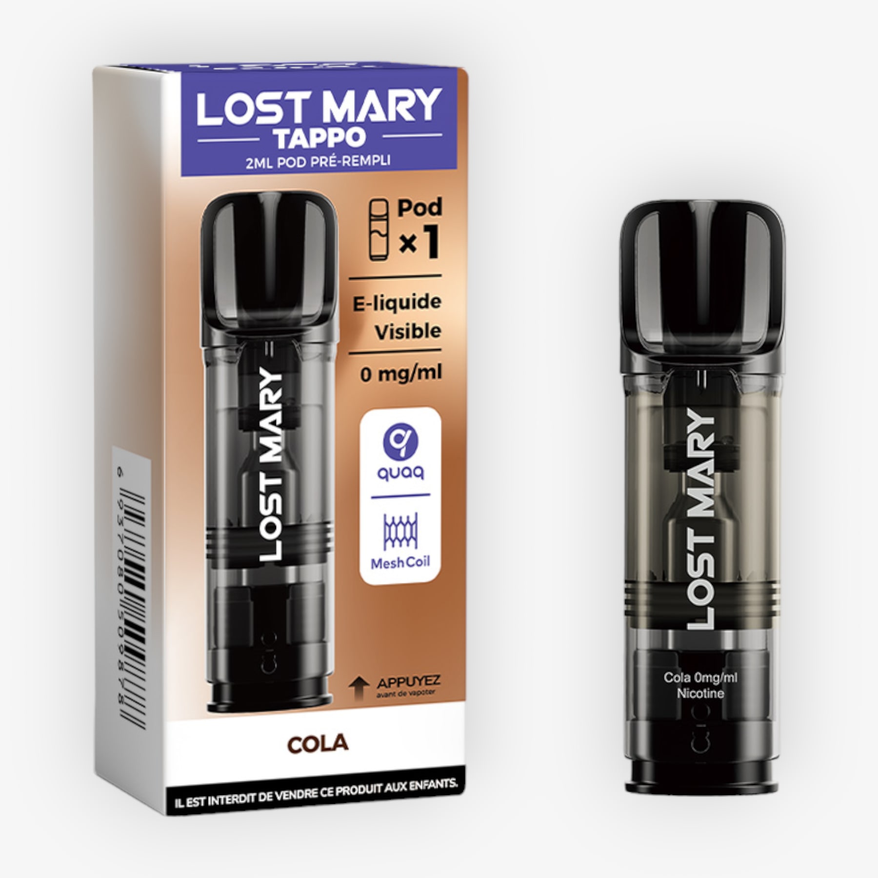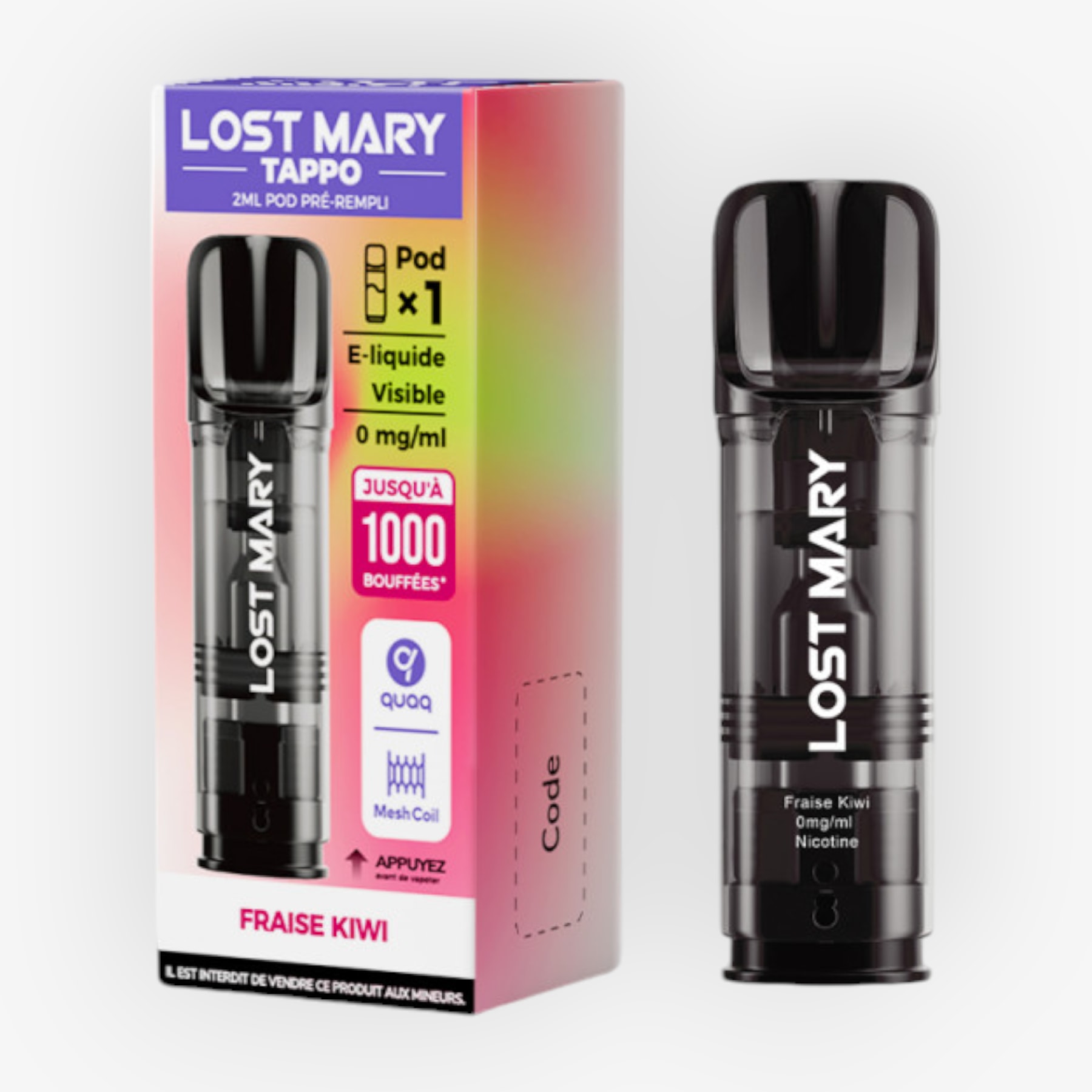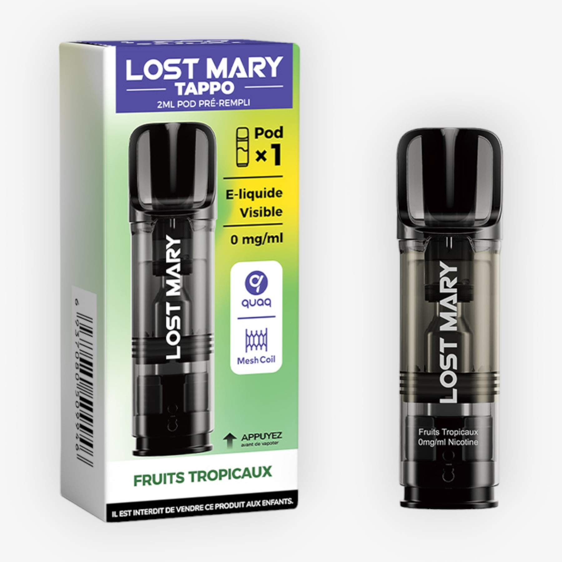 La cartouche Tappo de Lost Mary (75 x 32 x 24mm) est compatible avec la batterie de la puff rechargeable Tappo Air. Elle présente une contenance de 2ml, est préremplie d'un e-liquide offrant une saveur et ne contient aucune nicotine. De plus, vous aurez vue sur le contenu d'e-liquide restant pendant que la technologie Quaq donnera lieu à une vapeur riche et à des saveurs pures.