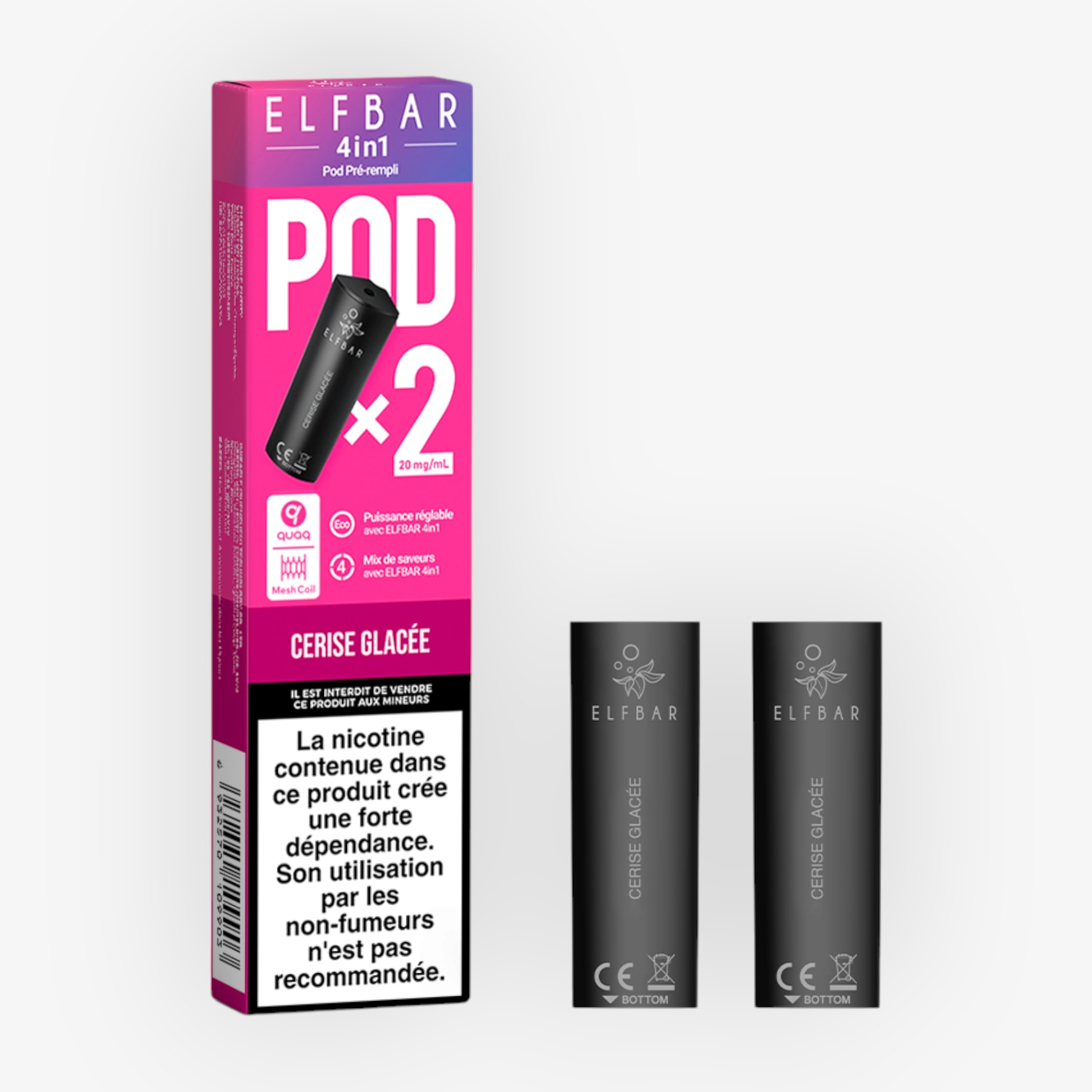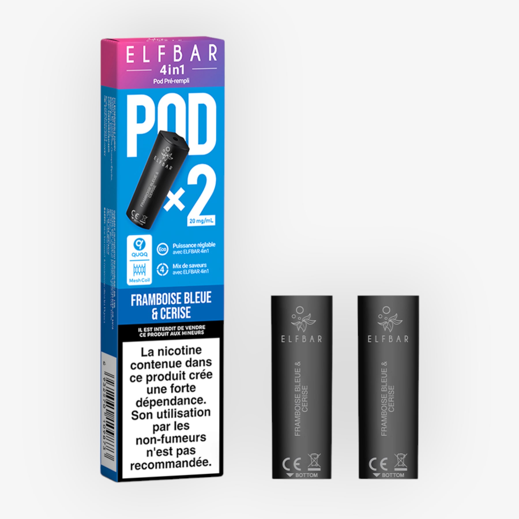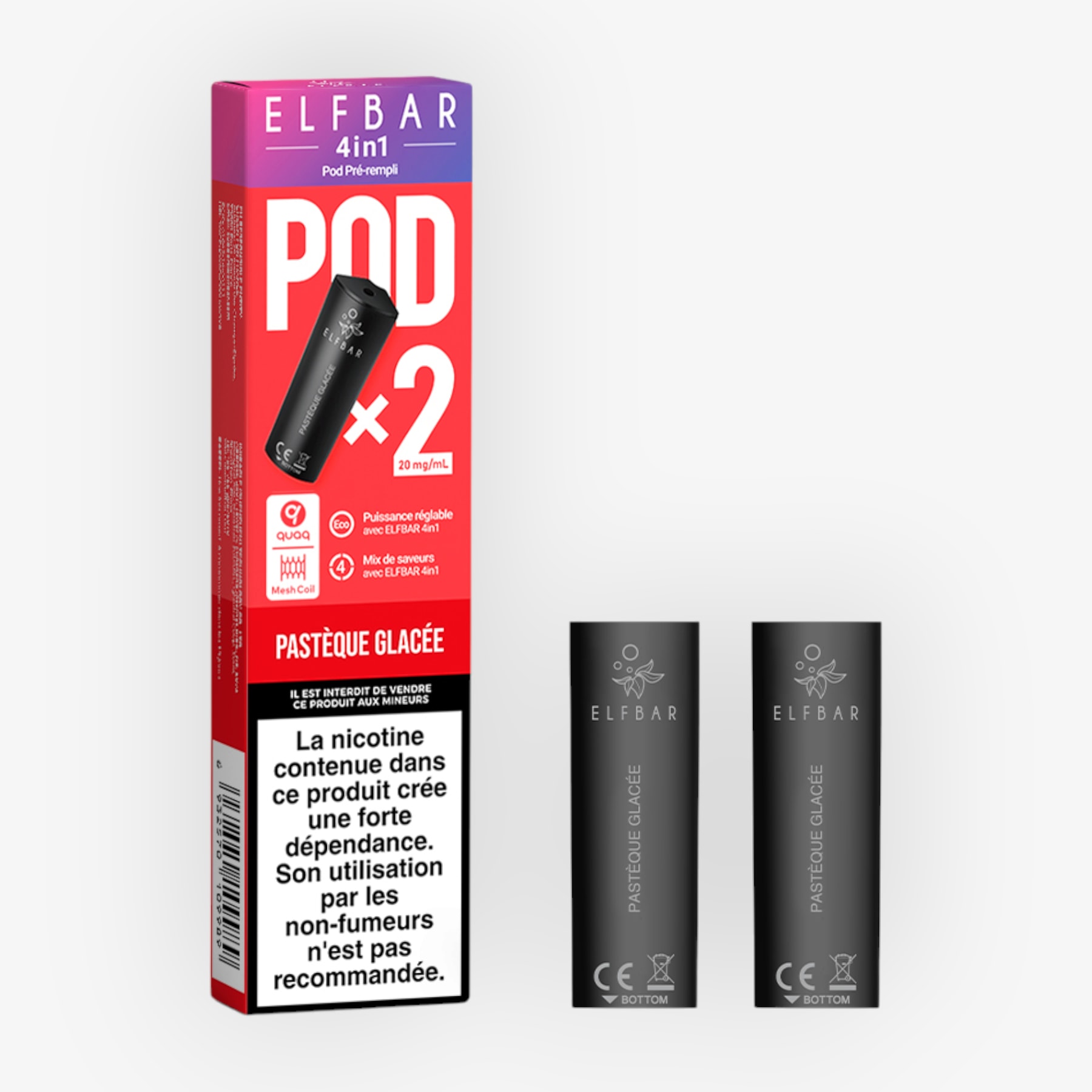 Ces cartouches sont destinées à la puff Elfbar 4en1. Elles sont préremplies de 2ml d'e-liquide et contiennent 20mg de sels de nicotine.