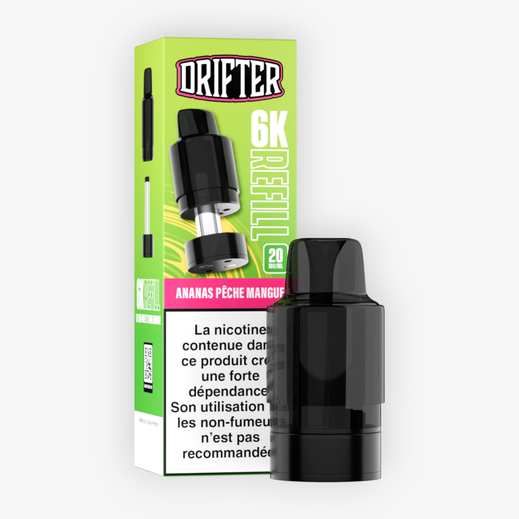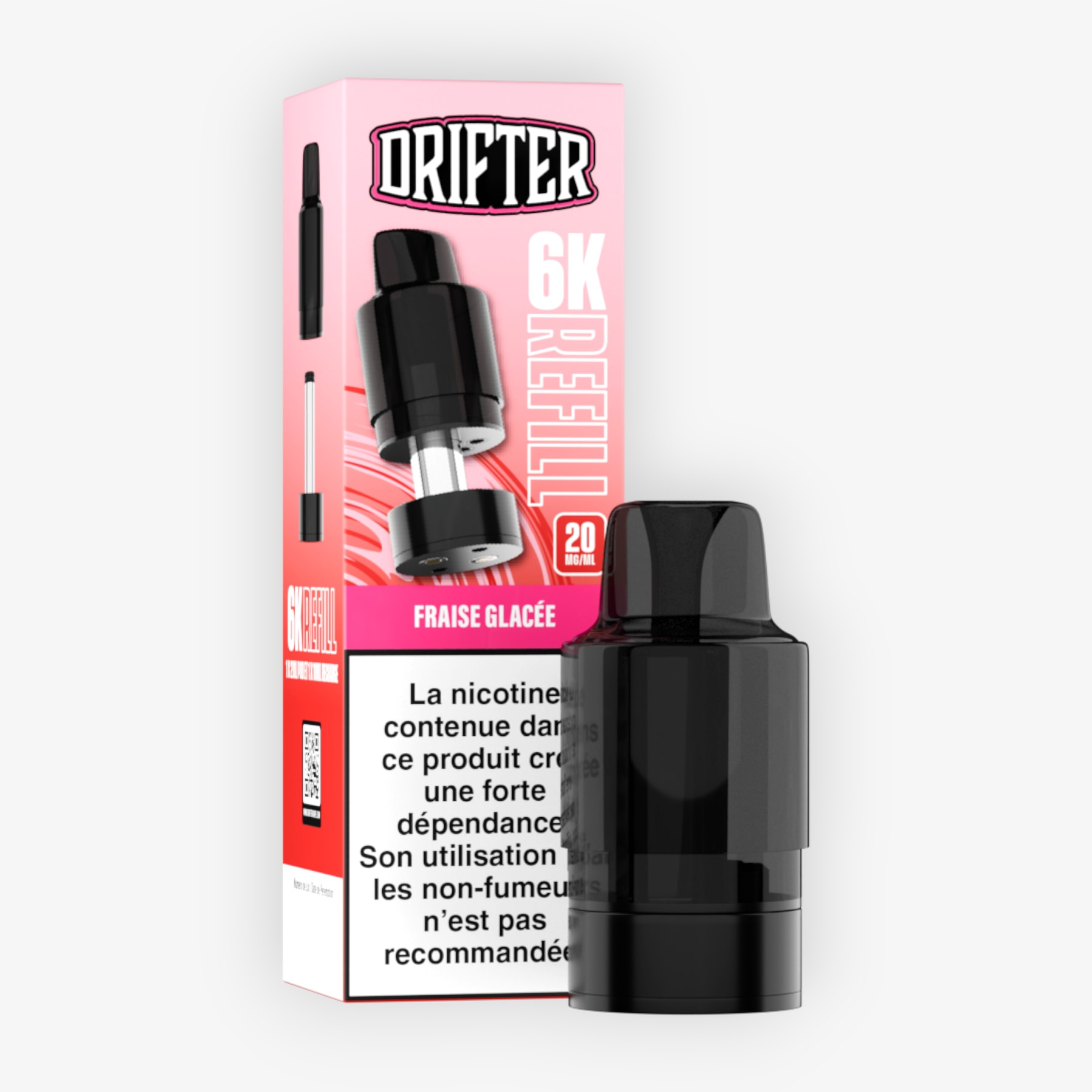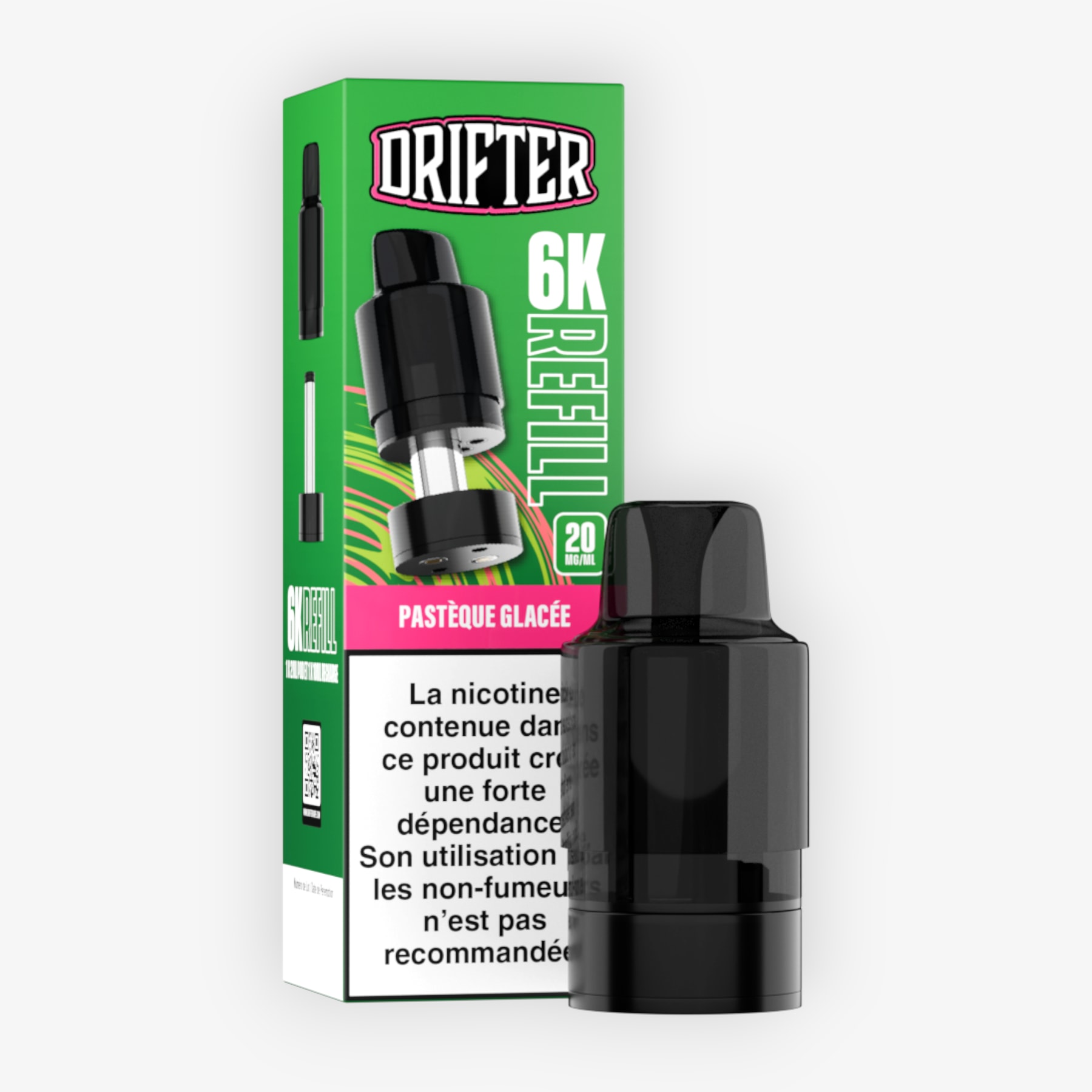 Préremplie de 2ml d’e-liquide, associée à un réservoir de 10ml et dosée à 20mg de sels de nicotine, la cartouche 6k Drifter Bar est conçue pour fonctionner sur la batterie de la puff du même nom (non fournie), le tout formant une puff contenant 12ml d'e-liquide et permettant 6000 taffs. Une fois cette cartouche vidée, conservez la batterie, rechargez-la via un câble USB Type-C et remplacez la cartouche en choisissant parmi les nombreuses saveurs disponibles.