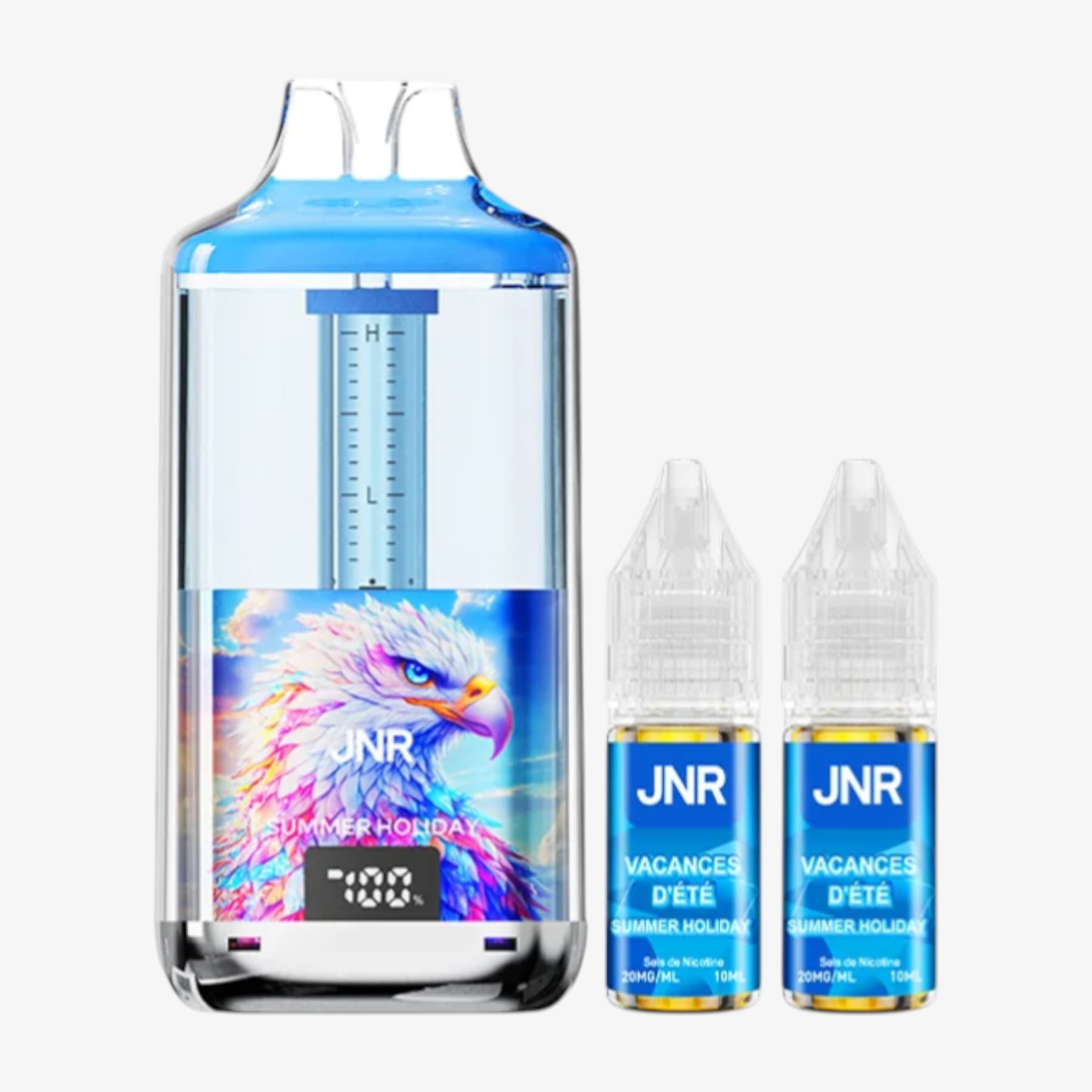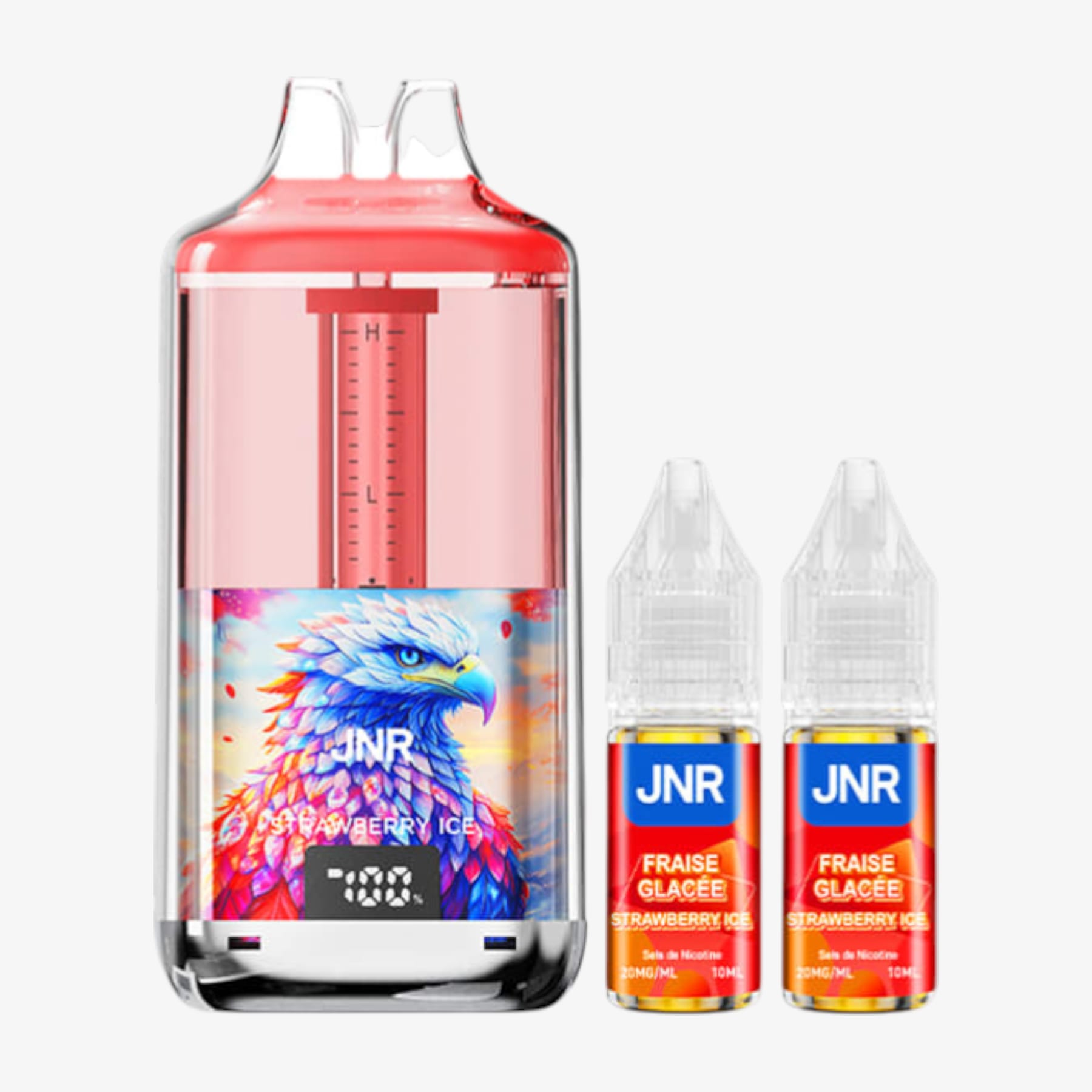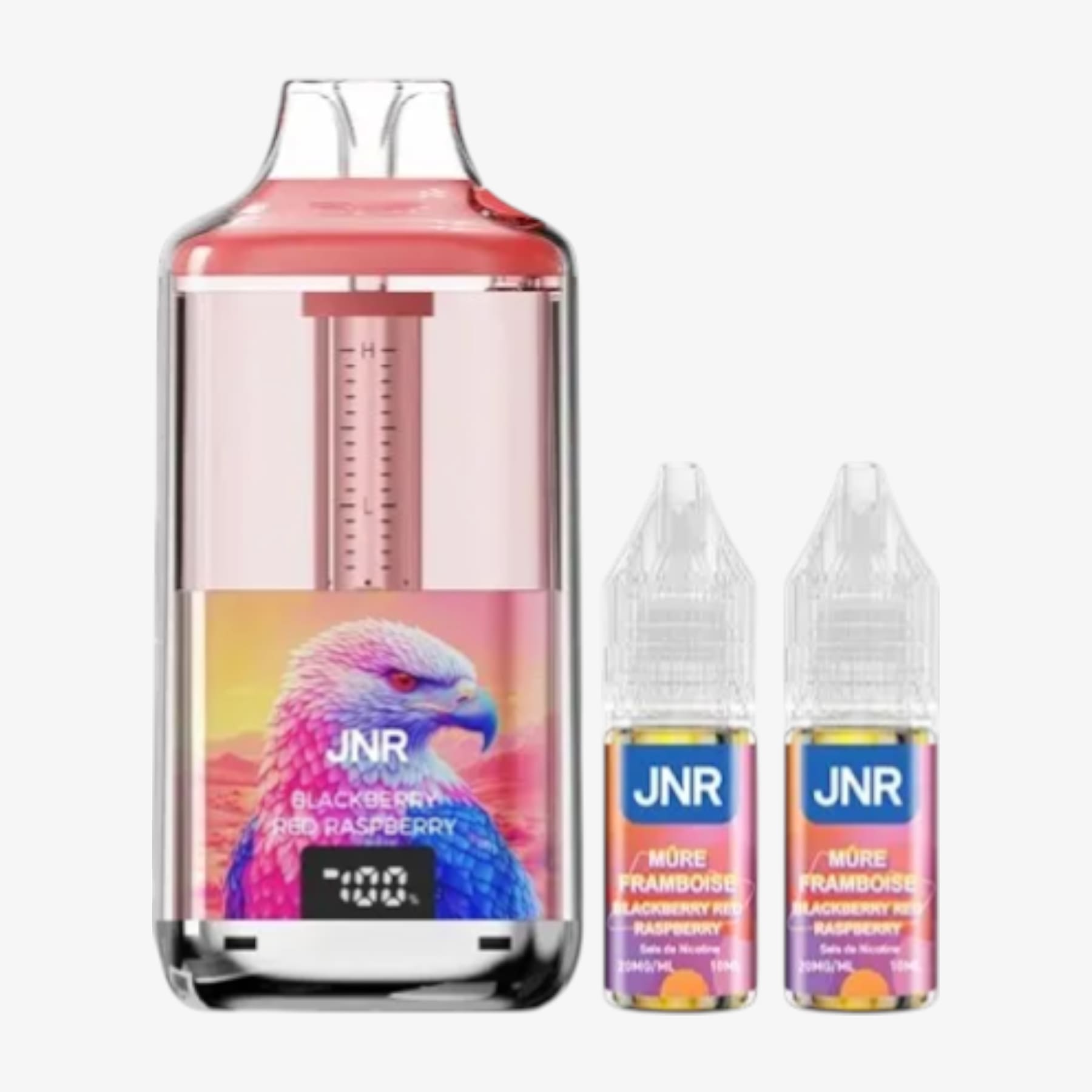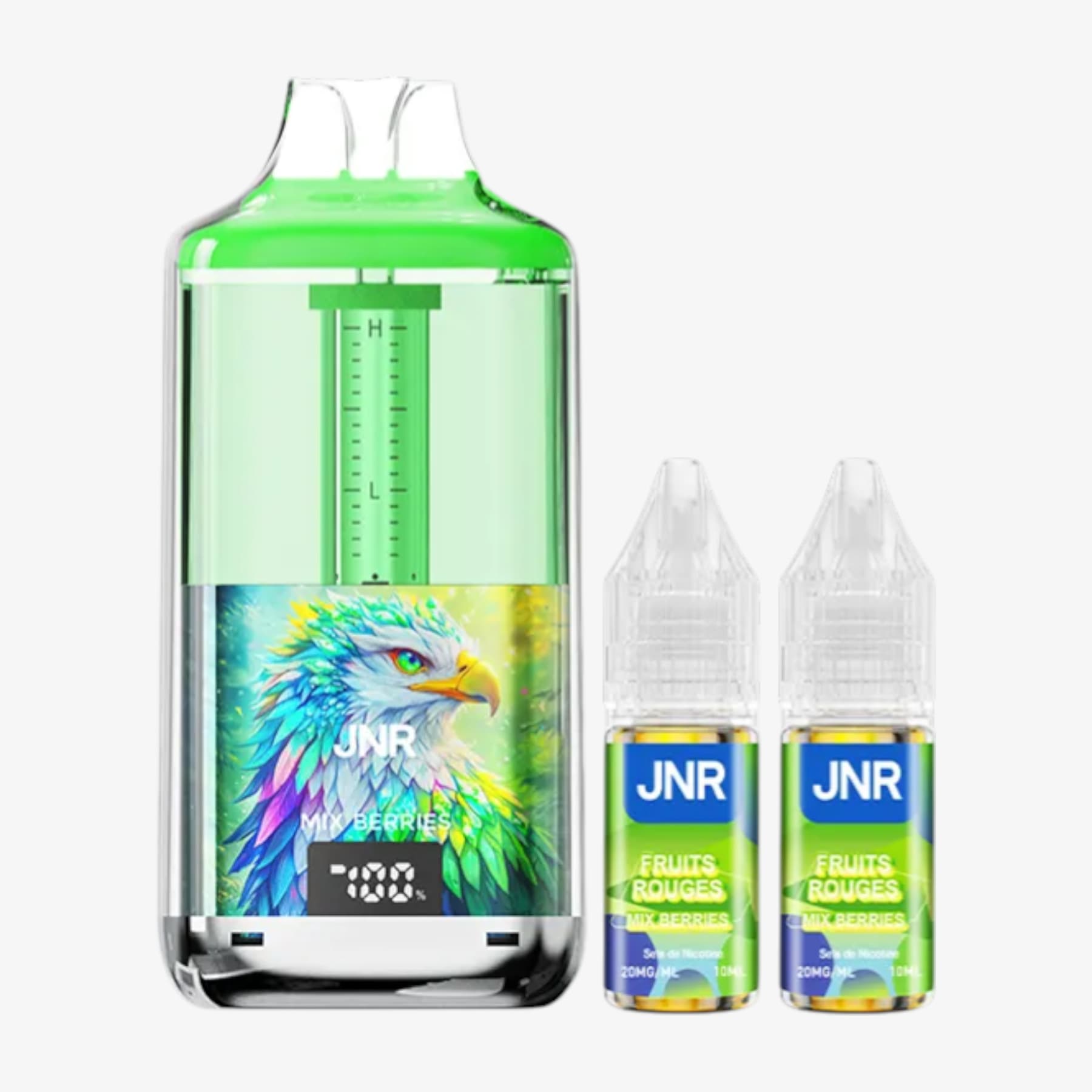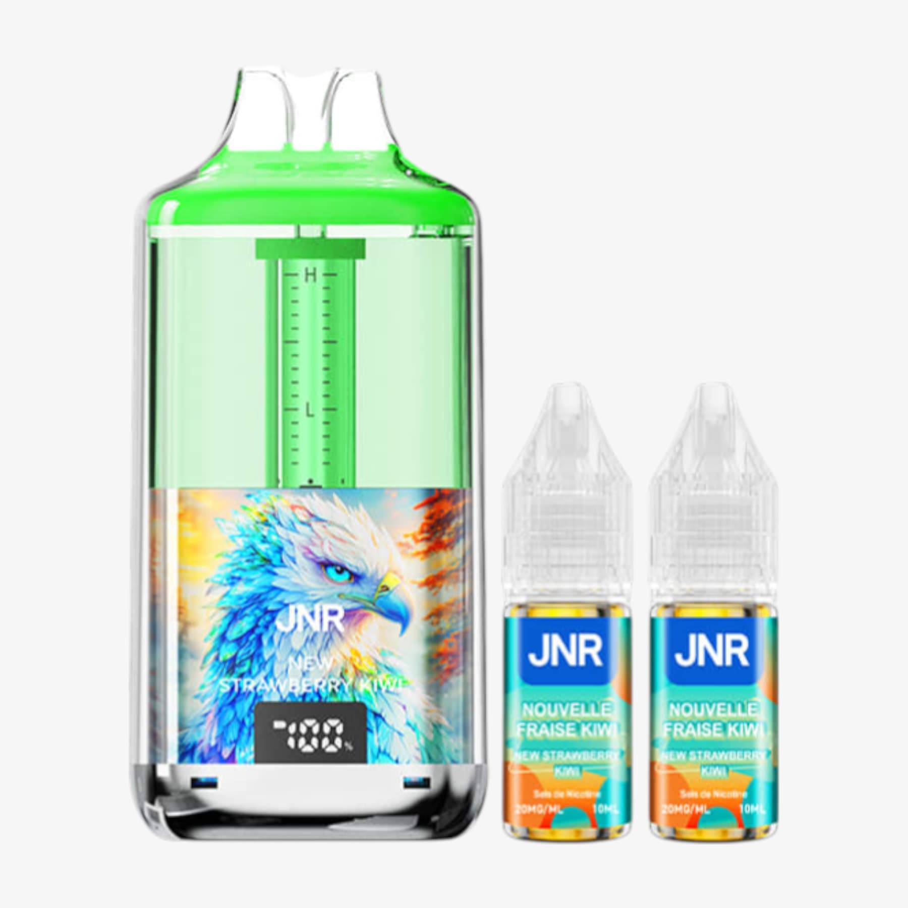 La Falcon Gem+ 30k de JNR constitue une big puff remarquable. En effet, elle compte un réservoir prérempli de 2ml et une batterie intégrée de 950mAh rechargable par le biais d'un câble USB Type-C (non fourni). Elle est également livrée avec 2 fioles de 10ml contenant chacune 20mg de sels de nicotine et, grâce à elles, vous aurez la possibilité de pratiquer la quantité impressionnante de 30000 bouffées. De plus, ce produit possède un écran indiquant le niveau de charge et un système de graduation du niveau d'e-liquide. Voilà donc une puff de référence.