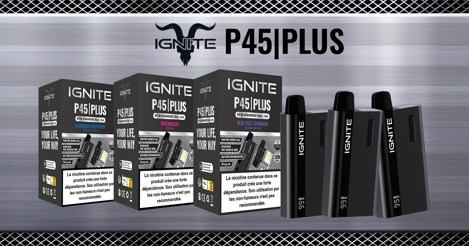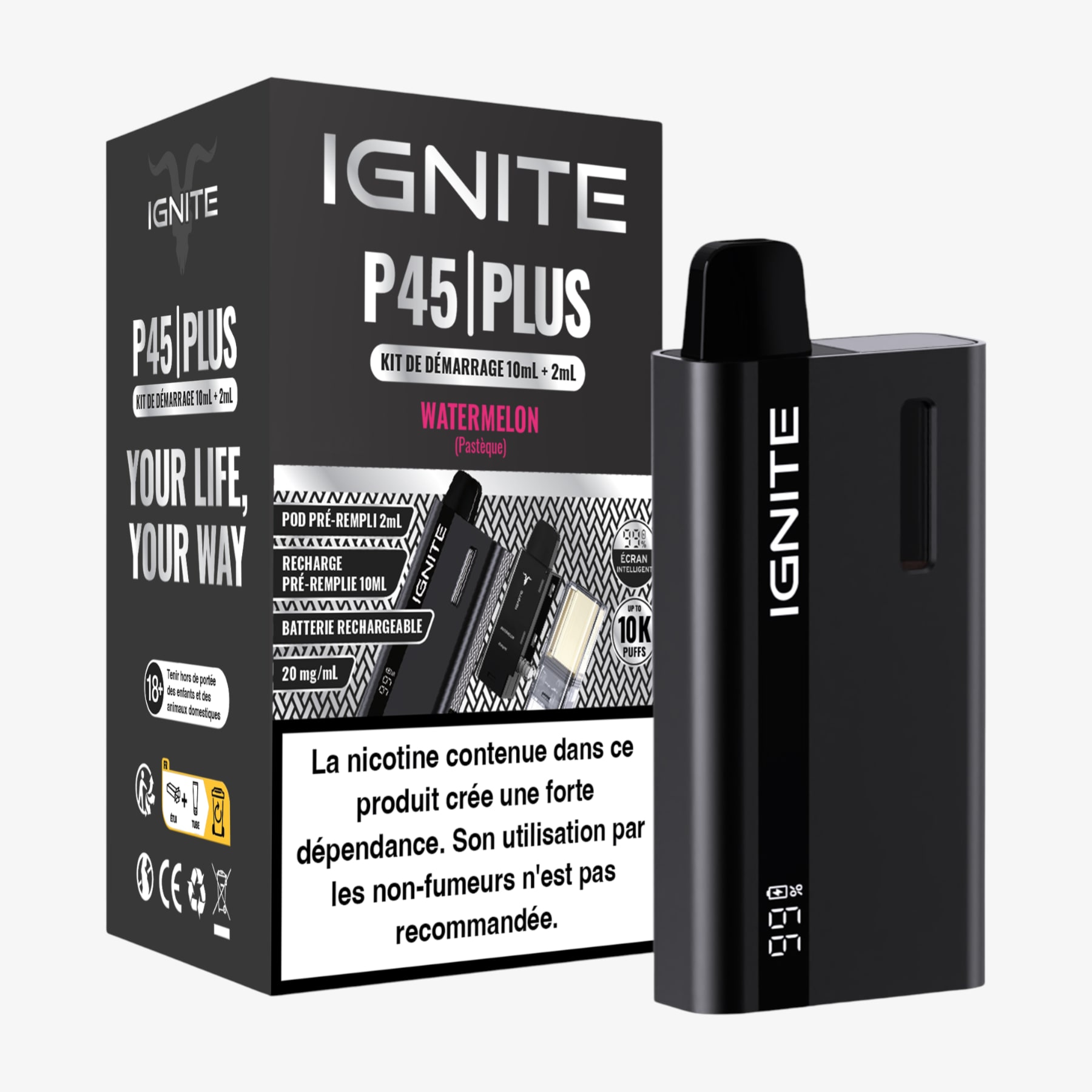 Ignite propose la P45 Plus 15k, une puff dotée d'une batterie rechargeable de 850mAh, dont la contenance atteint 12ml et dont la cartouche préremplie contient 20mg de sels de nicotine. Elle permet de pratiquer 15000 bouffées. En outre, cette puff facile à utiliser est équipée d'un écran qui indique le niveau de charge et elle s'oriente vers un tirage MTL. En somme, une puff de ce type s'avèrera parfaite si vous débutez dans la vape.